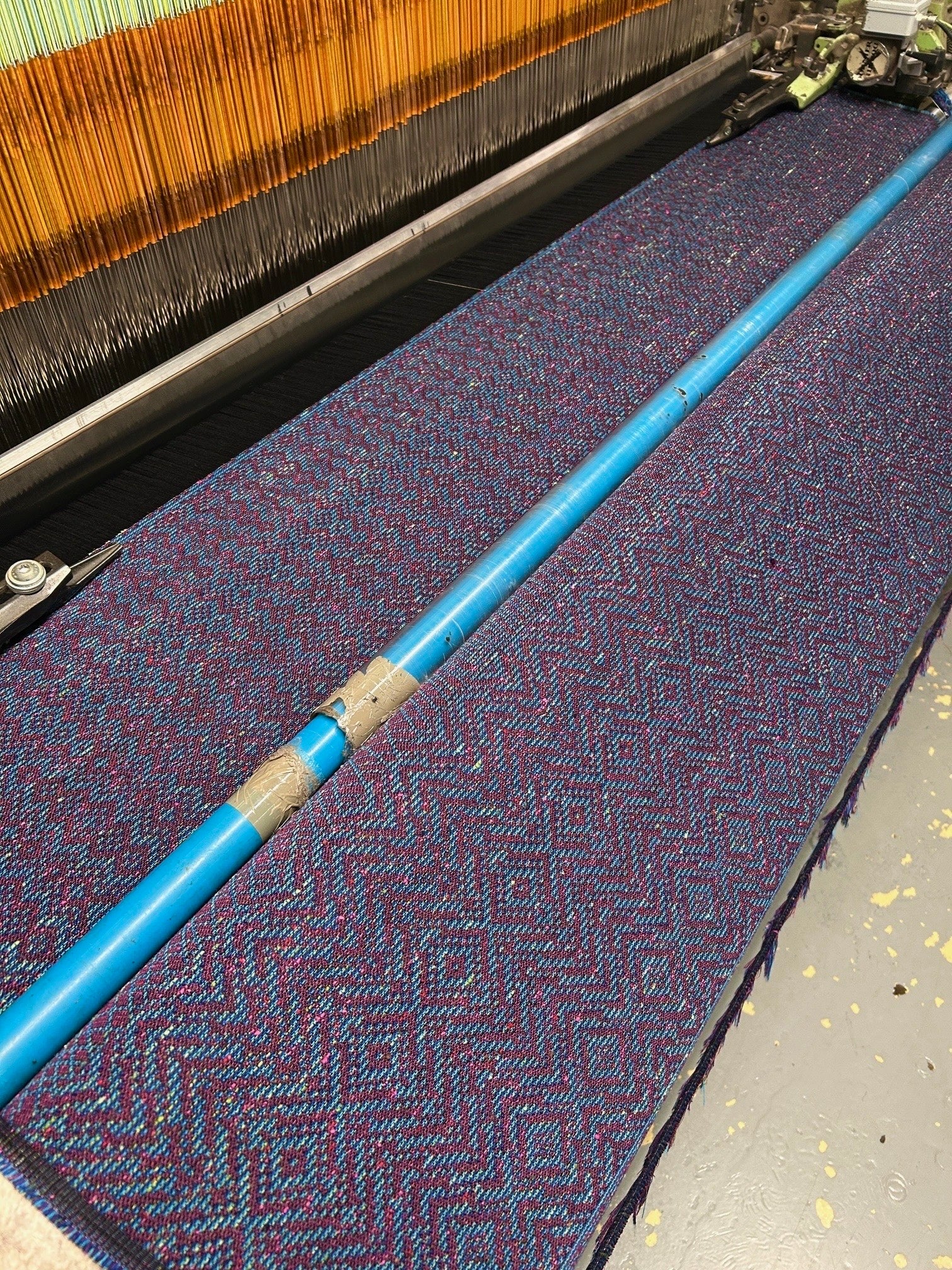 This pocketweave fabric is a beautiful meatloaf of fibres, using up all of the little leftovers! The black warp runs through the middle, and the two walls of weft are wonderfully harmonious. One weft is purple Shantung Viscose alternating with ‘Blackberry’ Mulberry Silk, while the other weft is FOUR colours alternating each other: amethyst Combed Cotton, mossy Shantung Tussah Silk, deep blue Egyptian Cotton/Cashmere blend, and quartz Combed Cotton.