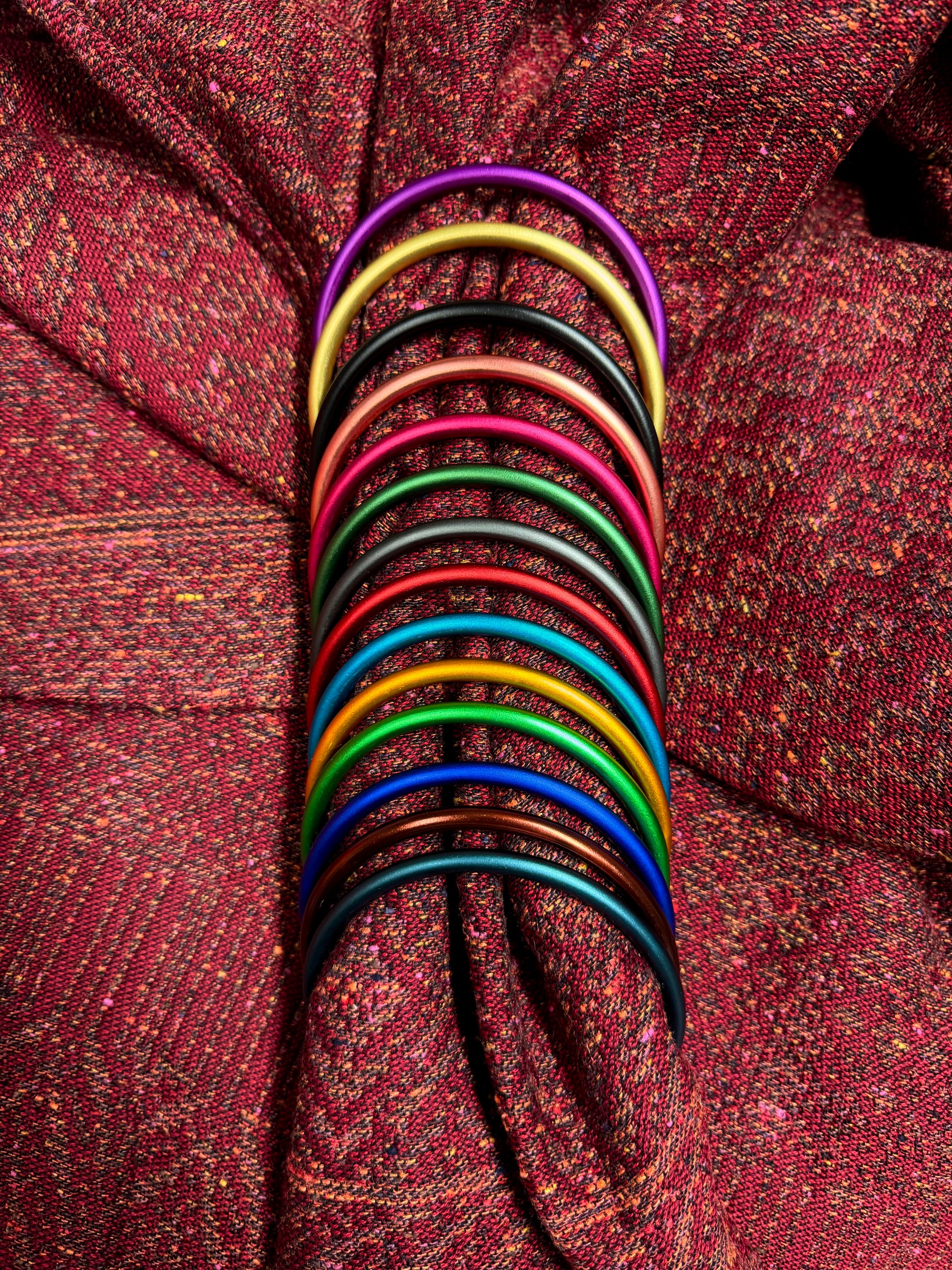 A rich and scrumptious pocketweave, the black warp runs through the middle - with two walls of weft, consisting of: red Combed Cotton alternating with Bordeaux Italian Merino. While the second weft is 4 colours alternating each other: orange Jaspe Silk, prune Silk Noil, berry Shantung Viscose, and passion Silk Noil.