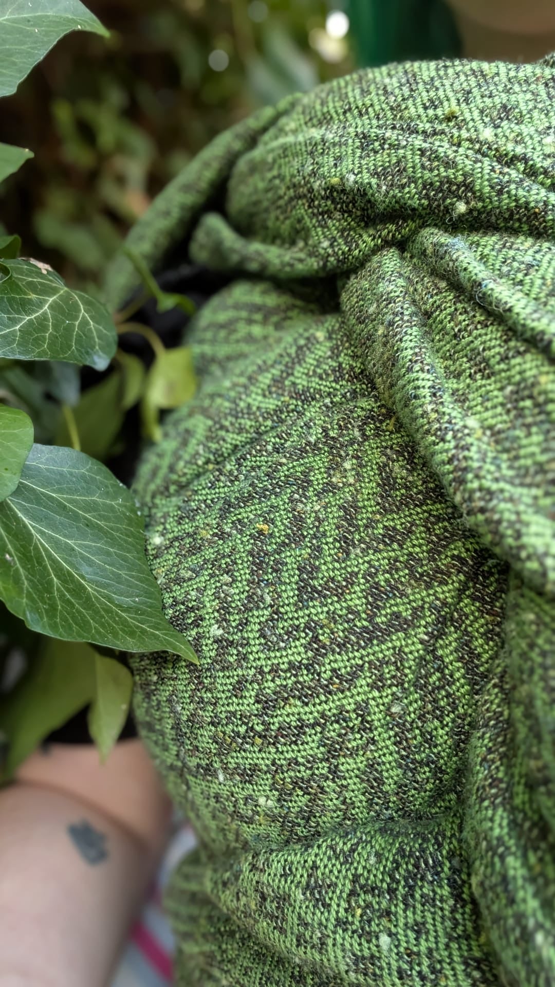 A luscious green pocketweave; the black warp running through the middle - with two walls of weft. Consisting of: mossy Shantung Tussah Silk alternating with Forest Silk Noil on one side, and a grass green Combed Cotton as the other side.